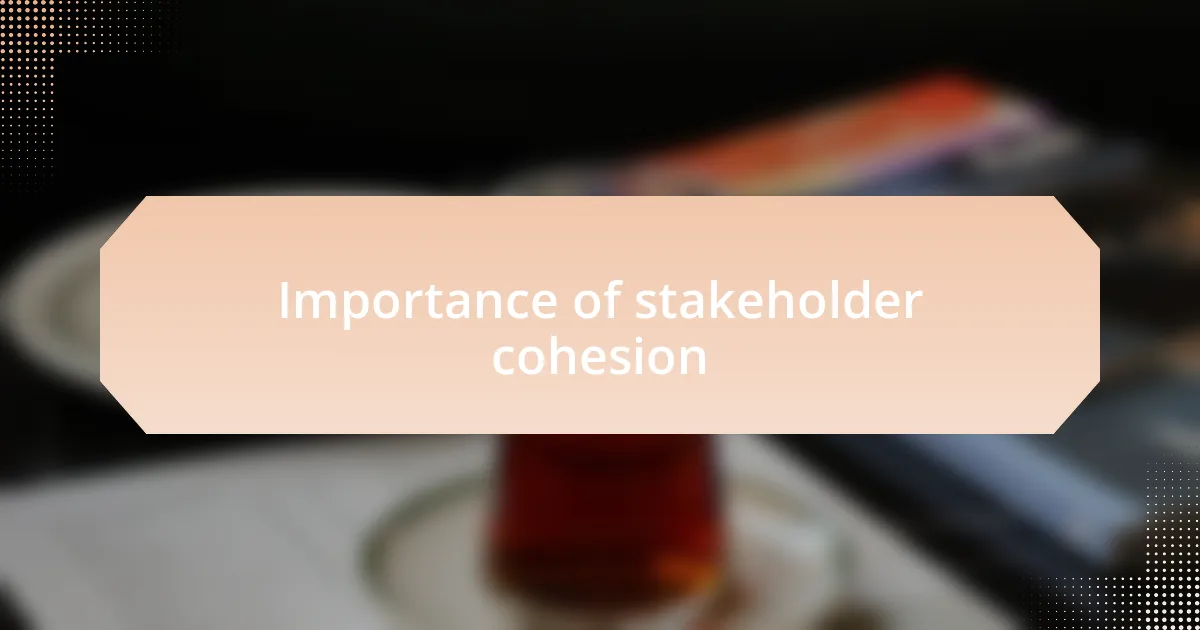 Cohesion among stakeholders is crucial for fostering collaboration and trust. I recall a project where stakeholders had conflicting views. By creating a dedicated space for open dialogue, I encouraged everyone to voice their concerns. The atmosphere transformed—what once felt like a battleground evolved into a forum for shared goals. Isn’t it remarkable how simply enabling conversation can dissolve tension?